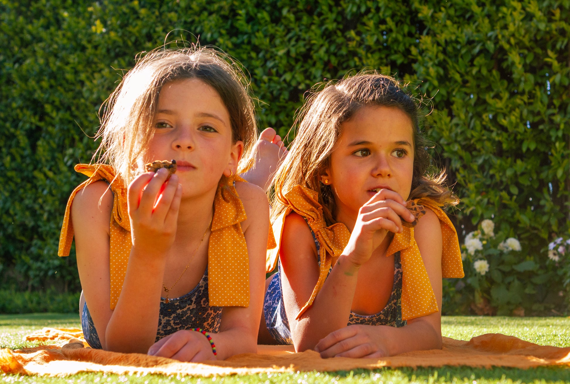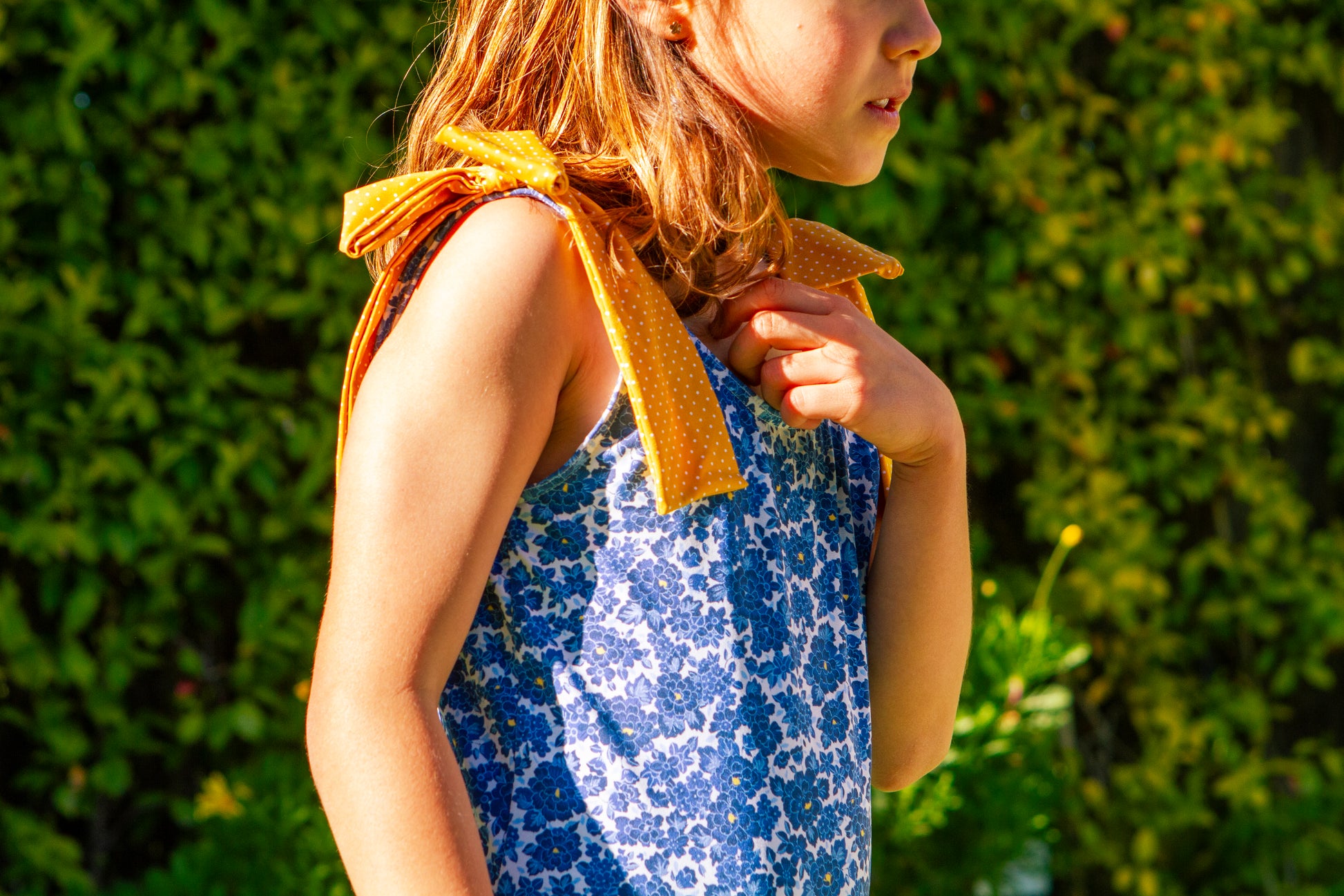 Bañador con estampado en flores azules y dos lazos en los hombros en estampado topito mostaza.