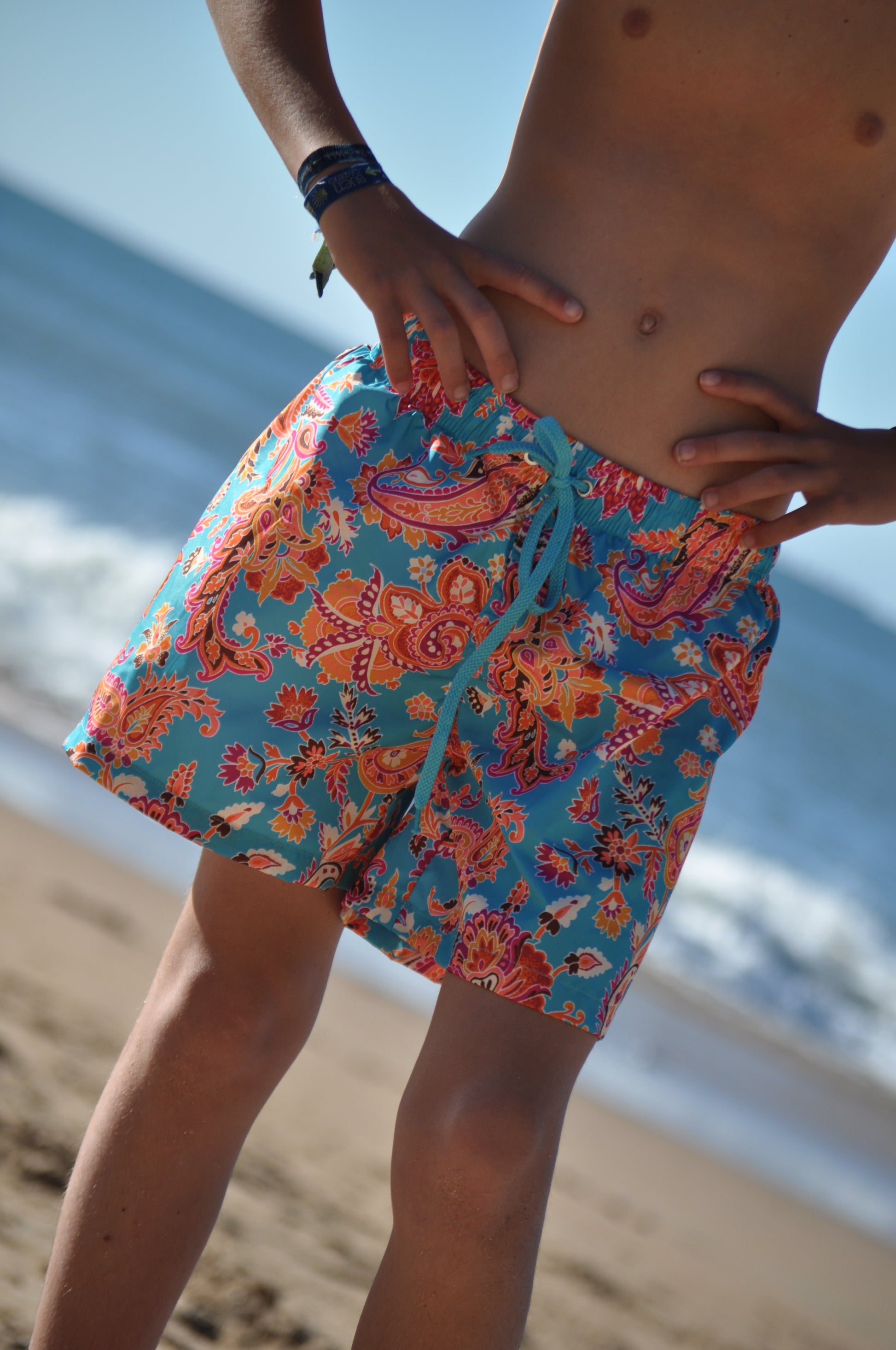 Bóxer clásico en estampado cachemira, tejido de secado rápido, cintura de goma con cordón y bolsillo trasero y laterales.